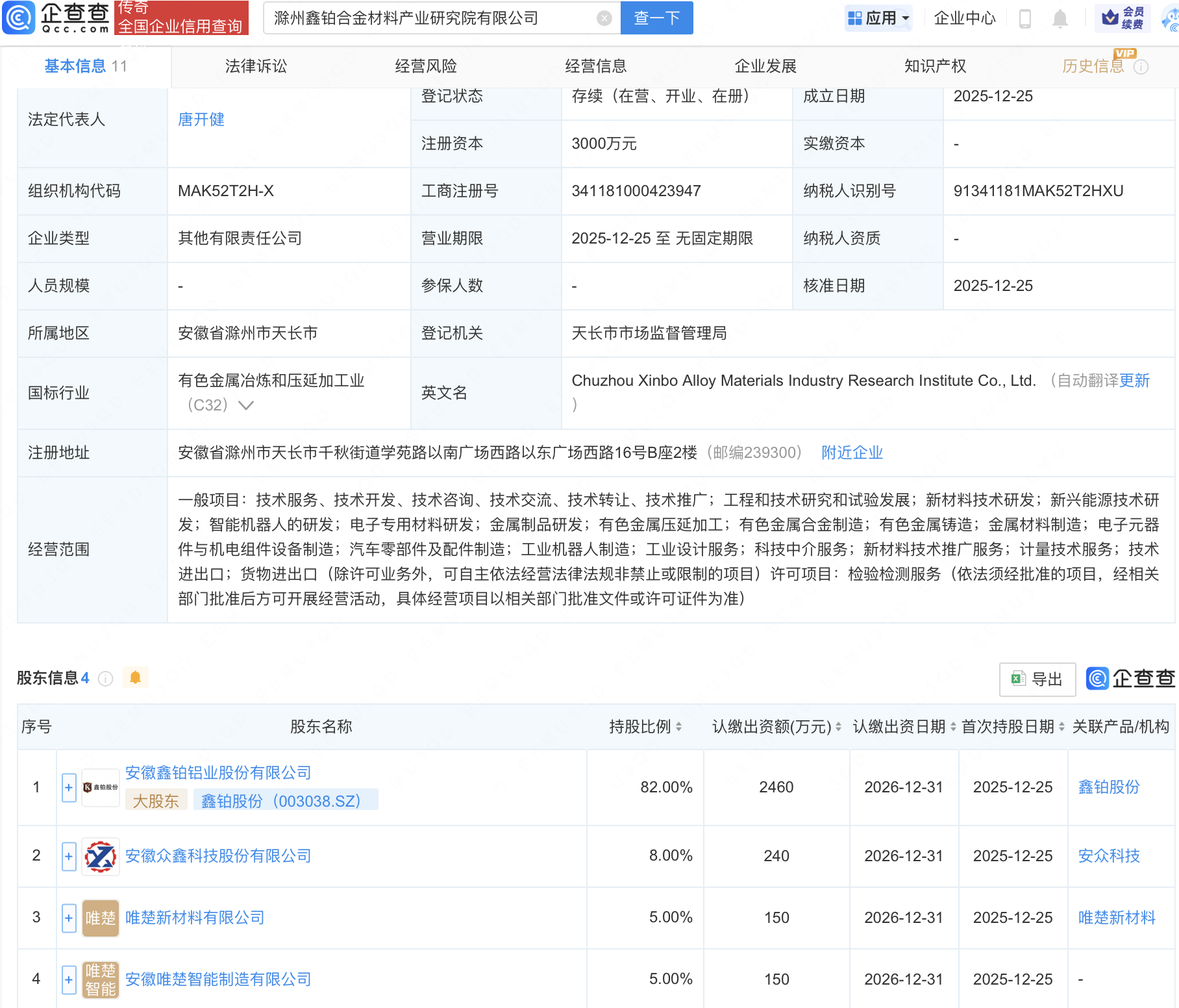 近日,滁州鑫铂合金材料产业研究院有限公司成立,注册资本3000万元首选配资炒股网,经营范围包含:新兴能源技术研发;智能机器人的研发;电子专用材料研发;金属制品研发等。企查查股权穿透显示,该公司由鑫铂股份(003038)等共同持股。